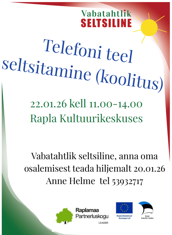 ESF+ projekti „Vabatahtlikud seltsilised Raplamaal vol 2“ raames korraldab MTÜ Raplatervis koolituse “Telefoni teel seltsitamine”. Koolitus toimub Rapla Kultuurikeskuses 22.01.26 kell 11:00-14:00.