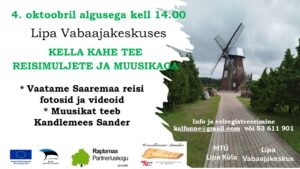 Lipa Vabaajakeskuses toimub 4. oktoobril kell 14.00 ESF+ projekti “Koos on mõnus” raames KELLA KAHE TEE. Info ja eelregistreerimine projektijuht Anne Kalf kaudu (e-postil: kalfanne@gmail.com või telefonil 5361 1901).