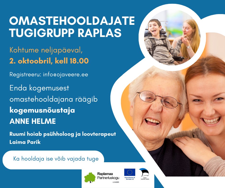 Mittetulundusühing Ojaveere esitas ESF+ toetusmeetmesse „Sotsiaalne heaolu“ miniprojekti „Vanemaealiste ja erivajadusega inimeste vaimse tervise hoidmine“. Projekti ühe tegevusena alustas Raplas omastehooldajate tugigrupp. 2. oktoobril algusega 18.00 räägib enda isiklikust kogemusest omastehooldajana kogemusnõustaja Anne Helme. Kohtumist modereerib ja ruumi hoiab psühholoog ja loovterapeut Laima Parik.