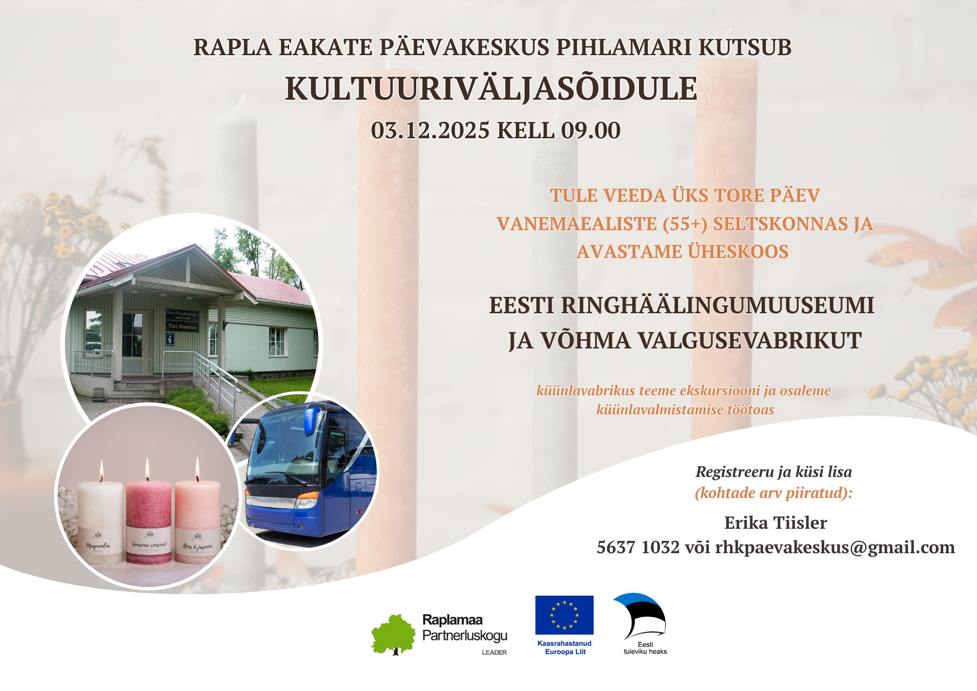 Rapla Vallavalitsus esitas Raplamaa Partnerluskogu ESF+ toetusmeetmesse „Sotsiaalne heaolu“ miniprojekti „Eakate heaolu ja aktiivsuse edendamine“. Esitatud projekti eesmärgi täitmiseks kutsub Rapla Eakate Päevakeskus Pihlamari vanusegruppi 55+ osalema 03. detsembril väljasõidul, kus külastatakse Eesti Ringhäälingumuuseumi ja Võhma Valgusevabrikut. Küünlavabrikus tehakse osalejatele ekskursioon ning osaletakse küünlavalmistamise töötoas.